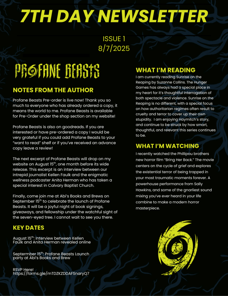 Thank you for reading this sneak peak from Profane Beasts! The book goes into wide release in one short month on September 15th under the watchful gaze of the Seven Eyed Tree. Pre-order today at https://shop.ingramspark.com/b/084?params=tJ8DX5HETKhsRwTt2xvbc4FTWgFKFzVT49NnHbr2q2r.
