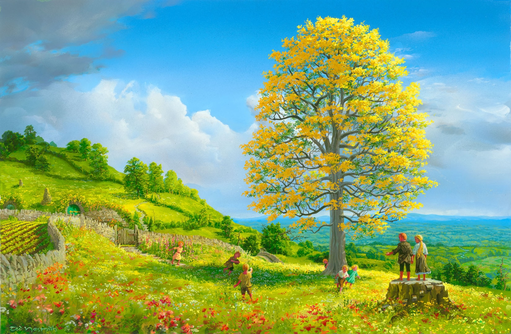 Towards the end of The Return of the King, after the Shire has been saved and the evil of Sauron defeated. Galadriel, one of the oldest of the Eldar ever to walk Middle-Earth begins her voyage to the undying lands. She stops in the Shire, and engages in all manner of Hobbit-like revelry, dancing and drinking with the rest of the Shire-folk. Galadriel also brings with her a few seeds of the Mallorn tree from Lothlorien to plant in the Shire before she leaves forever, never to return. Her gift is not wasted, and Samwise plants the seeds which grow into the last Mallorn Tree that ever stands in Middle-Earth. Even when Lothlorian fades, and magic leaves Middle-Earth, the Mallorn tree still stands as just a piece of what was lost.