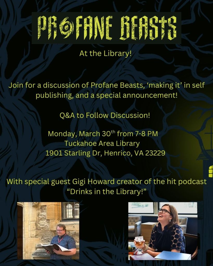 On March 30th from 7:00-8:00 PM, I’m going to be discussing self-publishing, Profane Beasts, and the importance of being a part of your local community at the Tuckahoe Area Library! I’ll be there with Gigi Howard of Drinks in the Library, and hope to see you there. I’ll also be making a HUGE announcement that I can’t wait to share that night. The flyer is below, and if you are planning on coming, I’ve got an RSVP form as well. Hope to see you there!